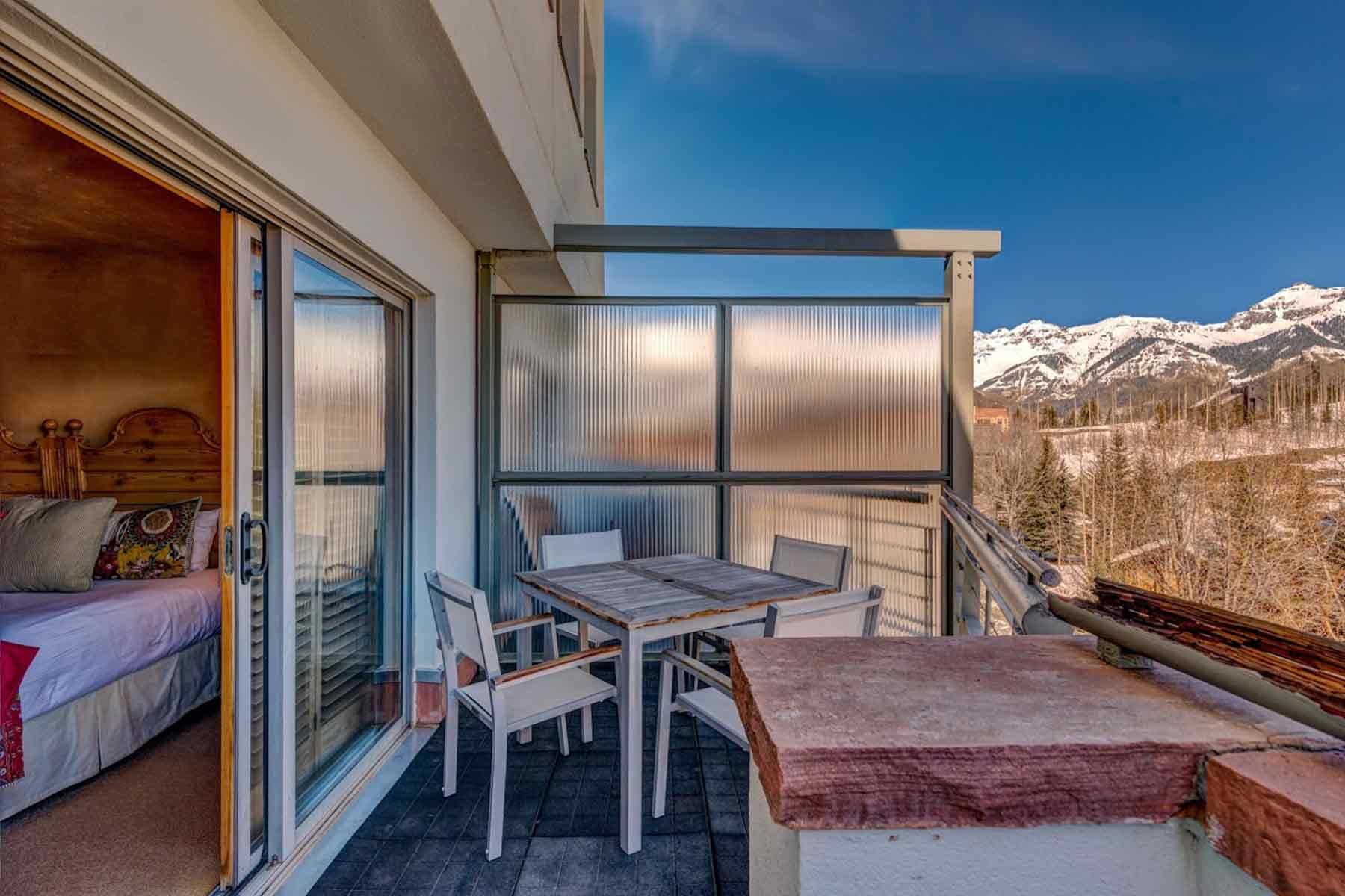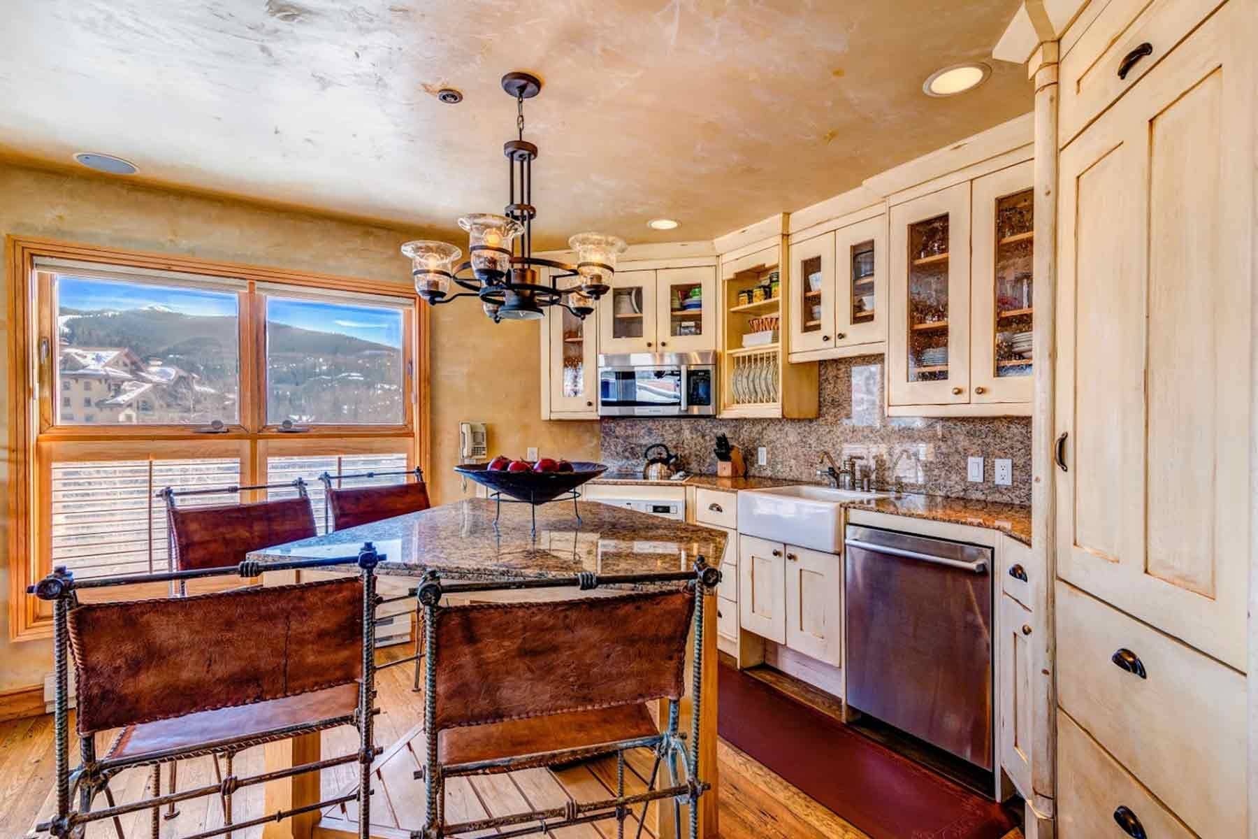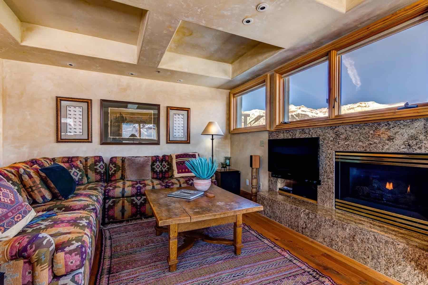 This cozy 7th floor corner penthouse features incredible ski area, Mt. Wilson, San Sophia, and village views to the west and south. Perfect for couples vacationing together or a small family. Hardwood floors, gas fireplace, and eat-in kitchen accentuate this charming mountain accommodation. Flat screen TV’s in the living room and primary master along with updated bathrooms offer a luxurious retreat after an invigorating day on the slopes. Primary master bath features a dual head steam shower and secondary master offers an oversized Jacuzzi tub, while both baths have heated flooring.