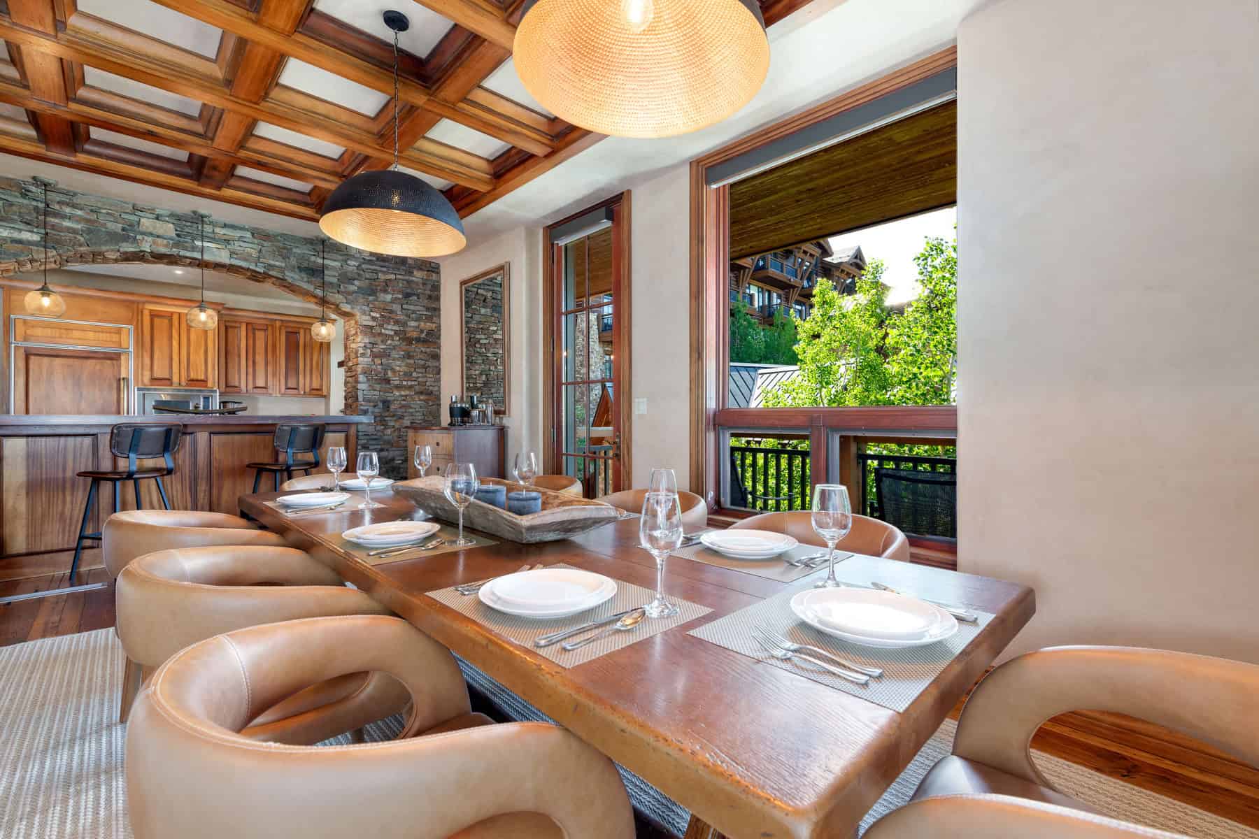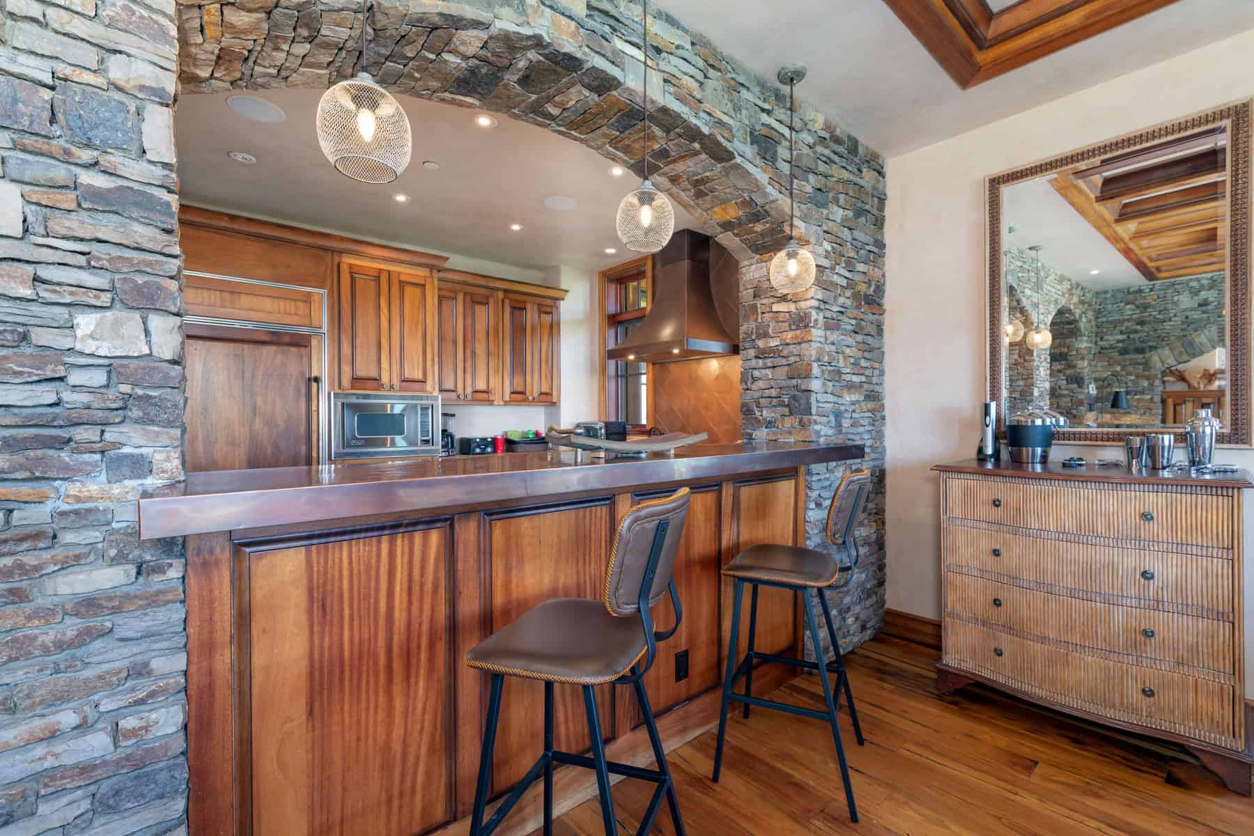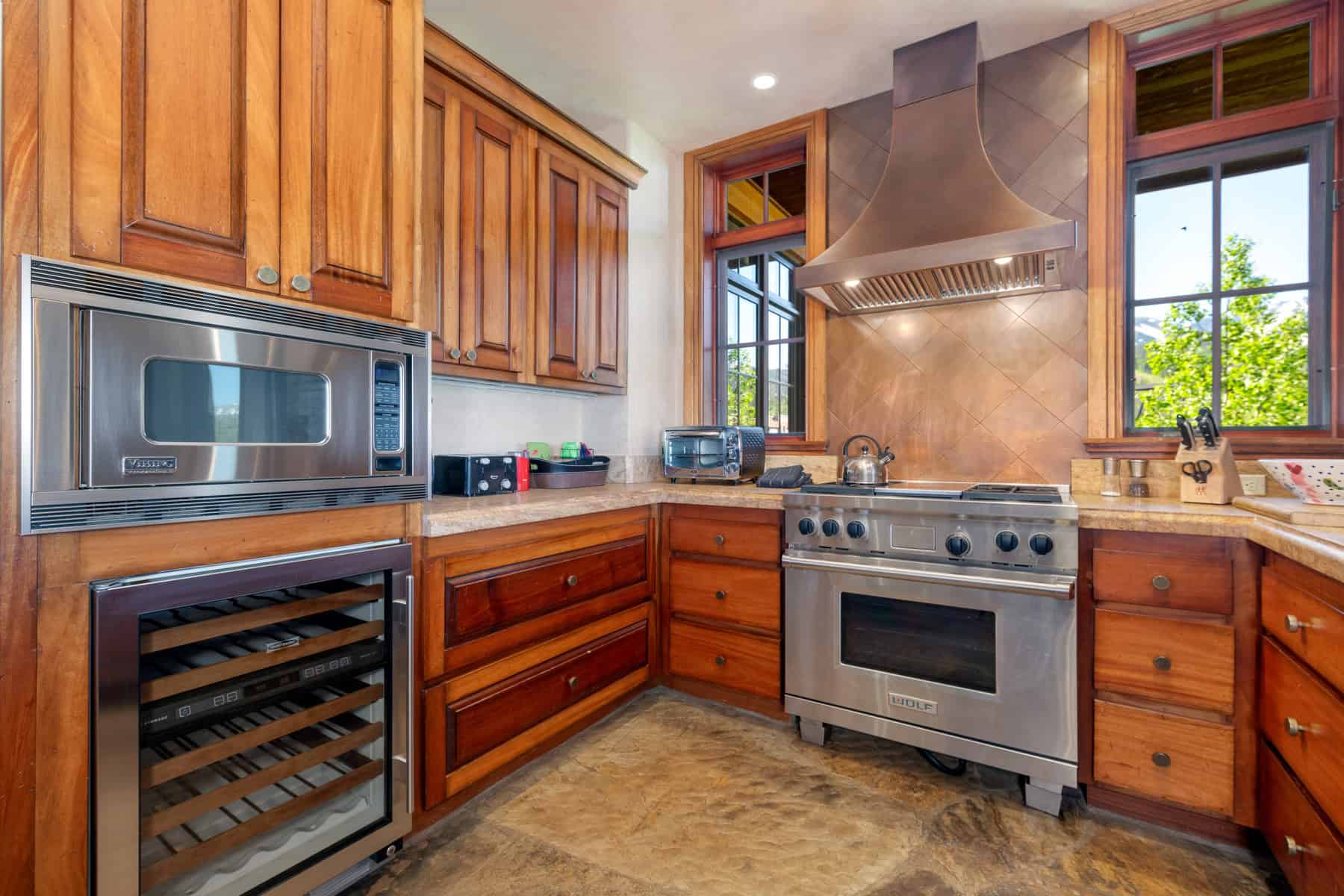 A gourmet kitchen, well-stocked with Wolf and SubZero appliances, urges guests to stay in, enjoy the bar seating, marvel at the sunsets to the west, and revel in the comfort and style of this exceptional accommodation.